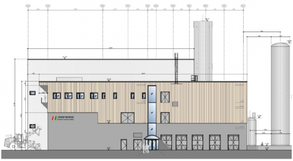 Für die werkseigene Verteilung des Betriebswassers soll ein unterirdischer Ausgleichsbehälter gebaut werden. Der Behälter wird aus Stahlbeton gebaut und umfasst separate Kammern für Trink-, Sprinkler und Betriebswasser, um eine flexible Nutzung zu ermöglichen.